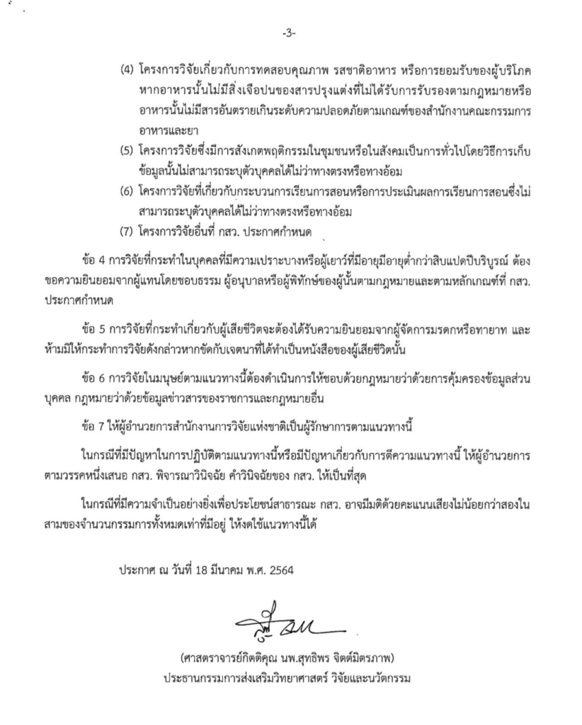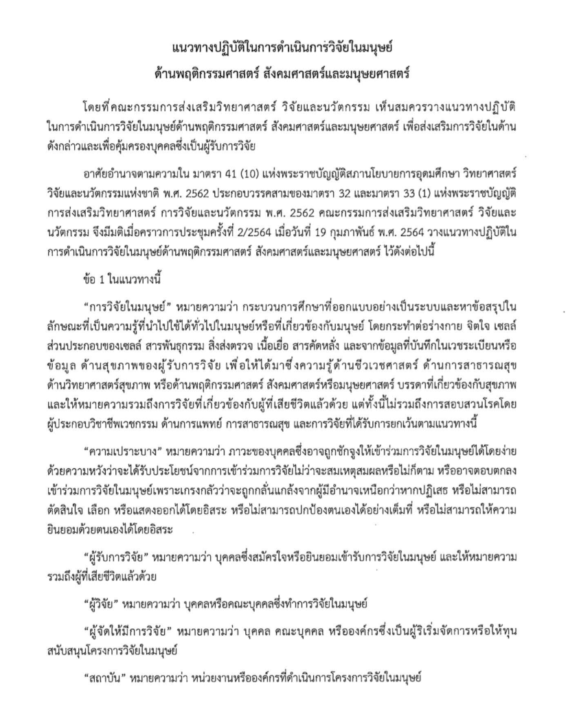 แนวทางปฏิบัติในการดำเนินการวิจัยในมนุษย์ด้านพฤติกรรมศาสตร์ สังคมศาสตร์ และมนุษยศาสตร์ ลงวันที่ 18 มีนาคม 2564